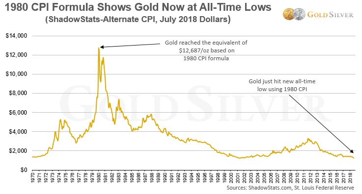 Further, you’ll see that based on July 2018 data, gold reached the equivalent of $12,687 per ounce at its 1980 peak.