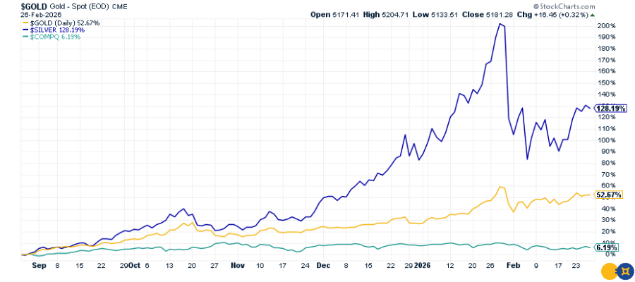 Gold and Silver vs. the Nasdaq (Sep 2025 – Feb 2026)