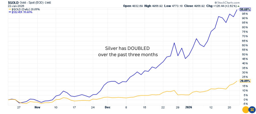 The rally has been explosive. Over the past three months, gold has surged over 20% while silver has nearly doubled in value. Both metals are trading at or near all-time highs.
