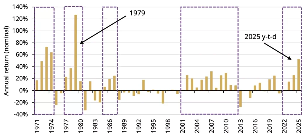 Source: Bloomberg, World Gold Council | Data as of 10/9/25. Based on the LBMA Gold Price PM.