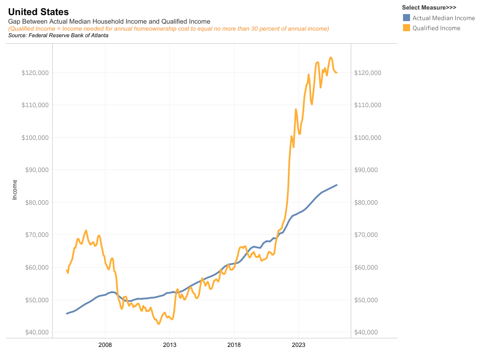 The chart above shows why. “Qualified income” is what a household must earn to keep homeownership costs — mortgage, taxes, and insurance — below 30% of annual income. That’s the long-standing affordability benchmark. Since 2020, the required income has surged. Actual median income has barely kept pace.